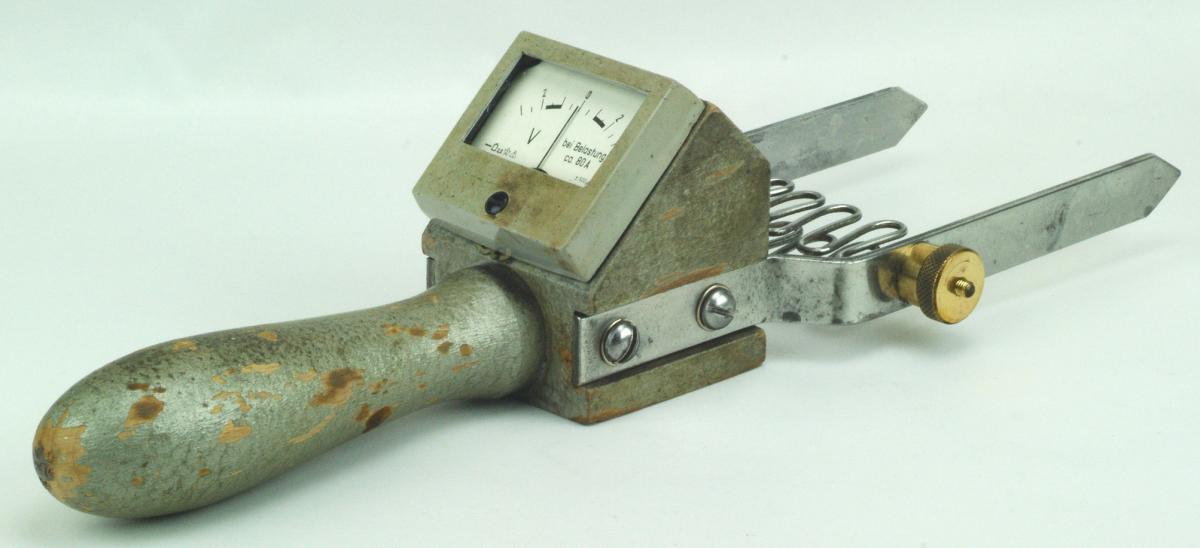 Ein Zellenprüfer für Blei-Akkus. Am hinteren Ende der Gabel erkannt man den Lastwiderstand.